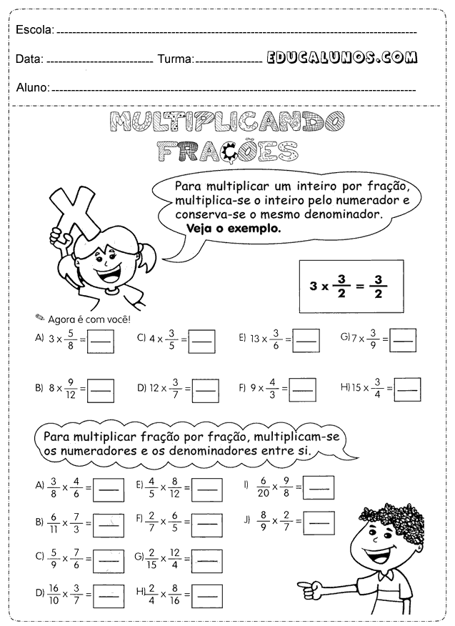 Atividades de multiplicação para o 2°ano, 3°ano, 4°ano e 5°ano do ensino fundamental que fala sobre: Calcule as multiplicações com números inteiros, resolva as questões, memorize a tabuada, aprenda com a explicação de como multiplicar um número inteiro por fração, troque os símbolos e descubra o resultado e faça a tabuada