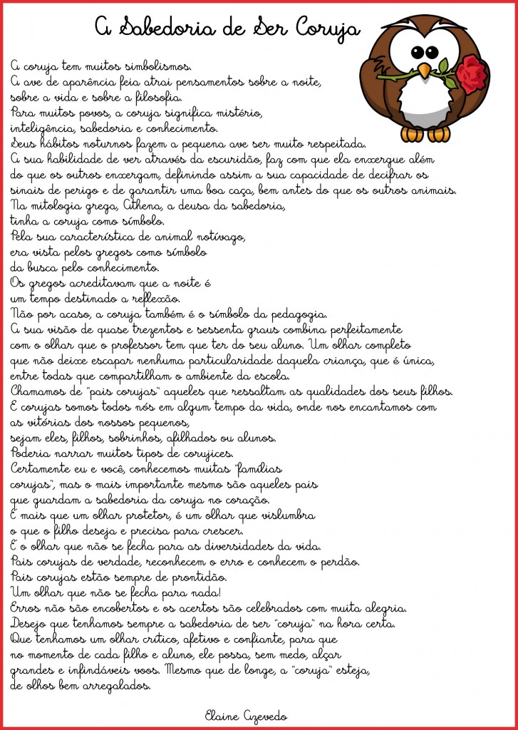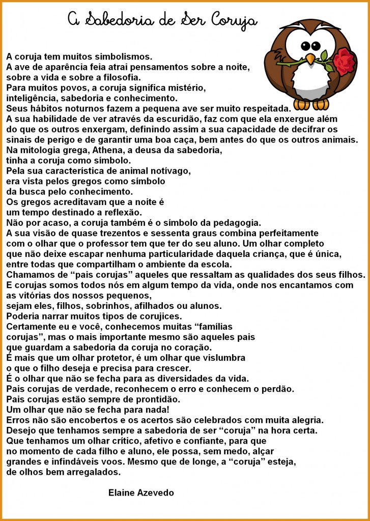 Desejo que tenhamos sempre a sabedoria de ser “coruja” na hora certa. Que tenhamos um olhar crítico, afetivo e confiante, para que no momento de cada filho e aluno, ele possa, sem medo, alçar grandes e infindáveis voos. Mesmo que de longe, a “coruja” esteja, de olhos bem arregalados.