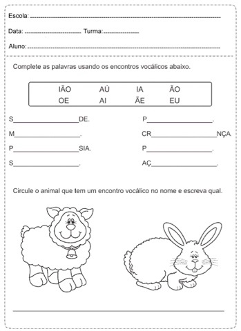 Atividades de alfabetização, Atividades sobre: Encontre as palavras e escreva perto dos desenhos, complete as palavras usando encontros vocálicos, circule o animal que tem o encontro vocálico no nome, escreva as palavras do quadro corretamente, ligue usando cores diferentes com as palavras que rimam e pinte o quadradinho para cada silaba, depois escreva-as.