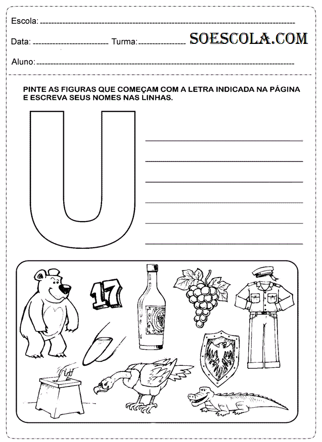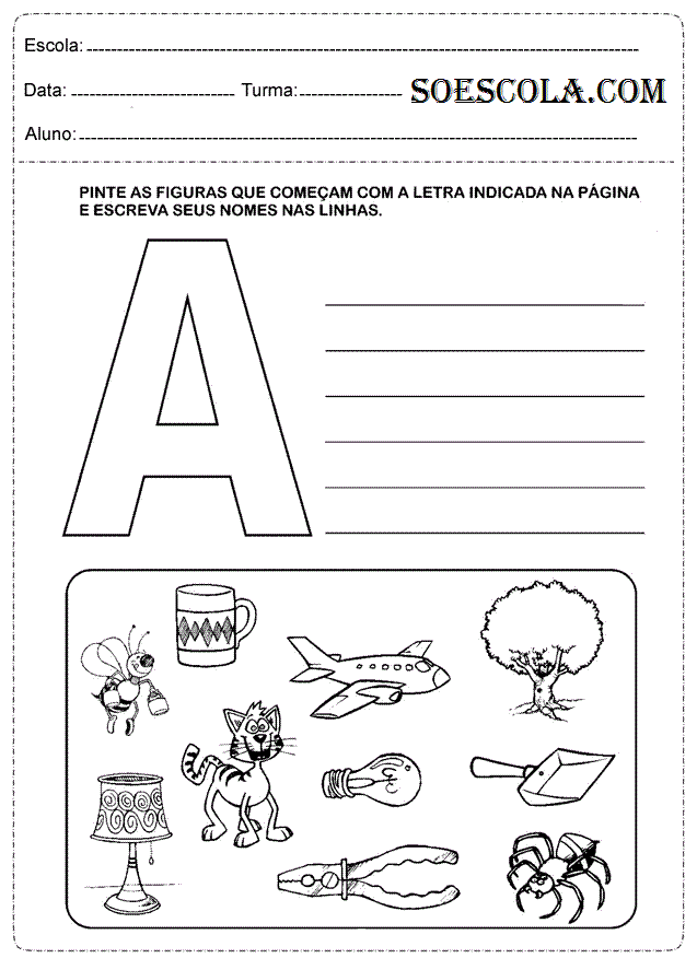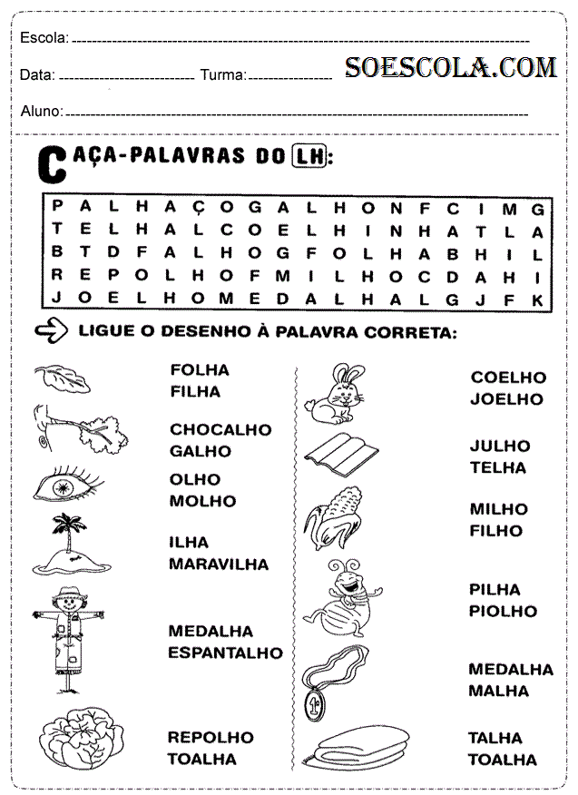 Provas de português para 1° ano do ensino fundamental sobre pinte as figuras que começam com a letra indicada na página e escreva seus nomes nas linhas, caça palavra do lh, recorte as palavras e cole na figura correspondente, complete as letras que faltam,escrevendo com legenda e cruzada infantil.