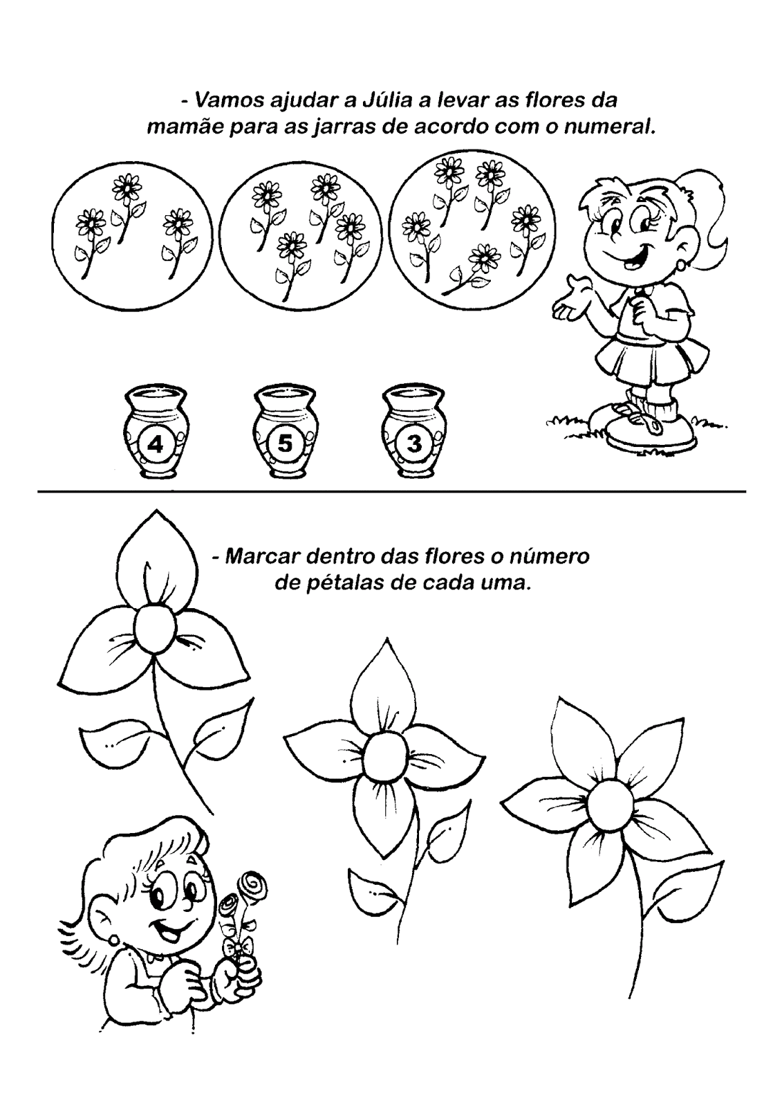 – Vamos ajudar a Júlia a levar as flores da mamãe para as jarras de acordo com o numeral. -Marcar dentro das flores o número de pétalas de cada uma.