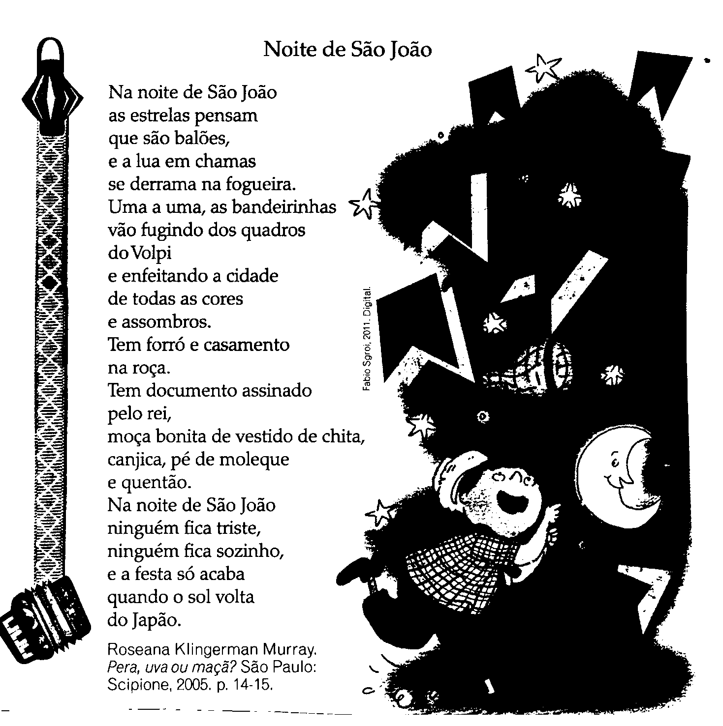 Na noite de São João as estrelas pensam que são balões, e a lua em chamas se derrama na fogueira. Uma a uma, as bandeirinhas vão fugindo dos quadros do Volpi e enfeitando a cidade de todas as cores e assombros. Tem forró e casamento na roça.
