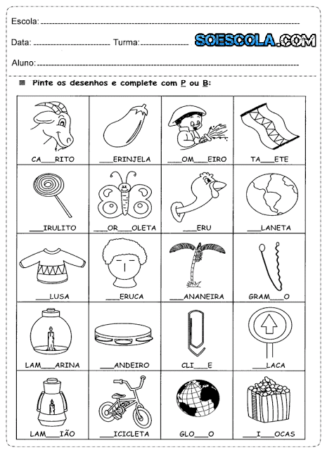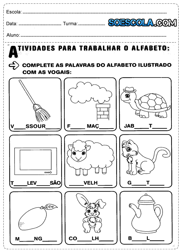 - Complete as palavras do alfabeto ilustrado com as vogais