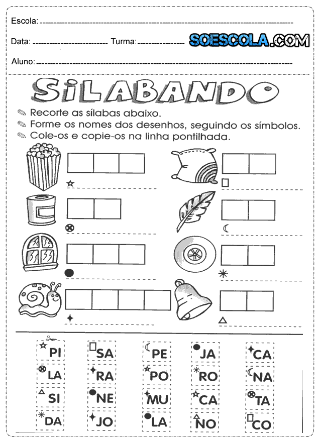 - Recorte as sílabas, fome os nomes dos desenhos e cole-os na linha pontilhada