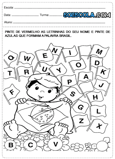 • Observe as letras que iniciam os nome dos desenhos> Depois escreva – os Pinte de vermelho as letrinhas do seu nome e pinte de azul as que formam …
