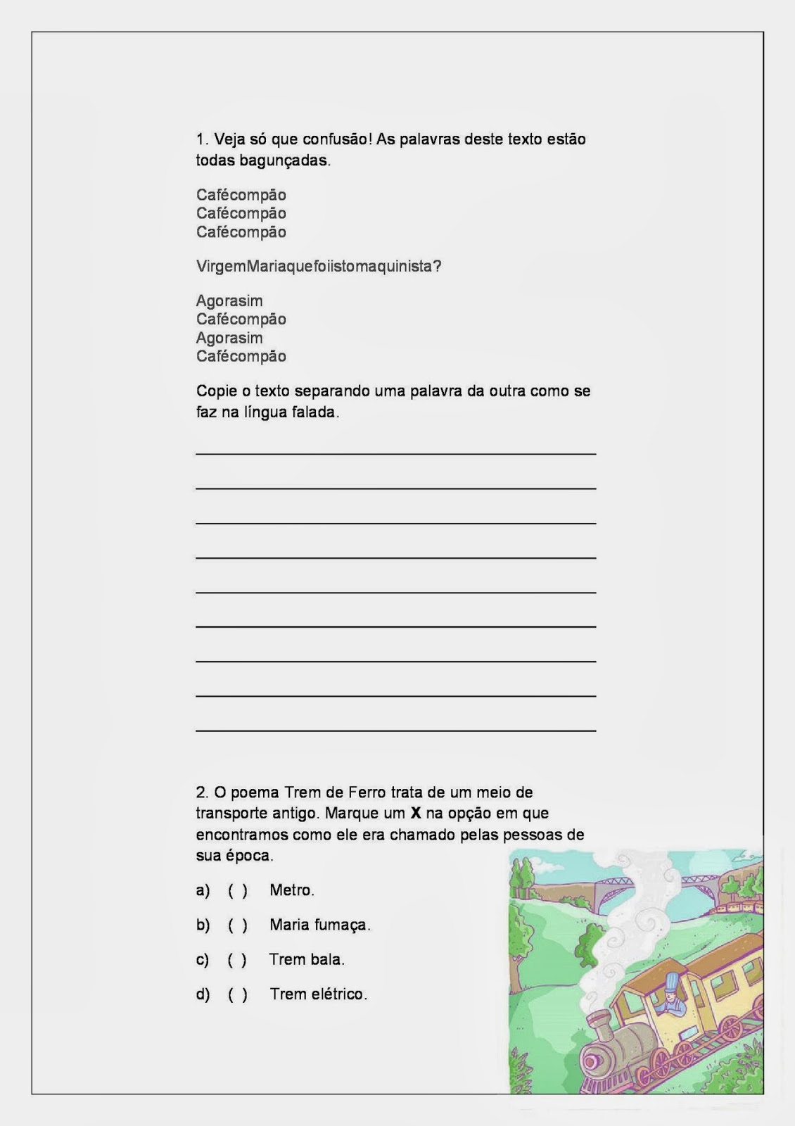 Para a postagem Trem de Ferro Manuel Bandeira trouxe o poema/música Trem de Ferro com algumas atividades de alfabetização para alunos do terceiro ano do ensino fundamental.