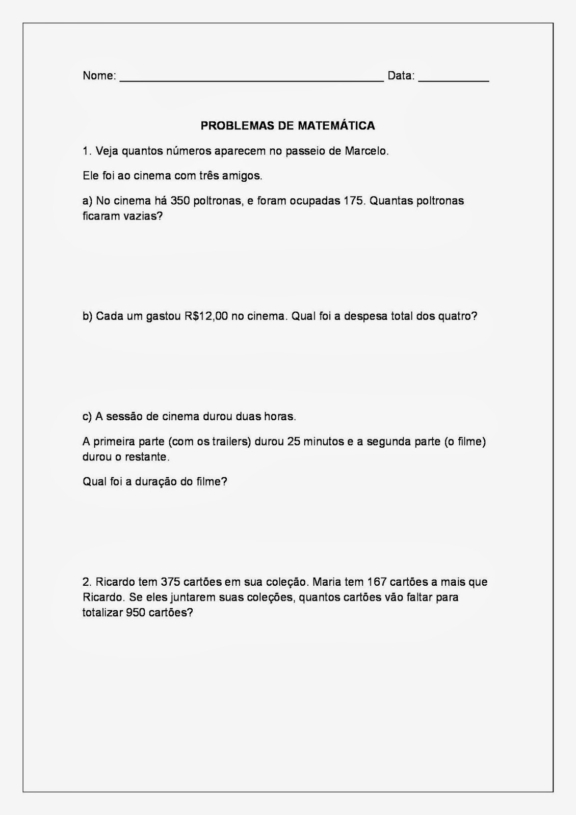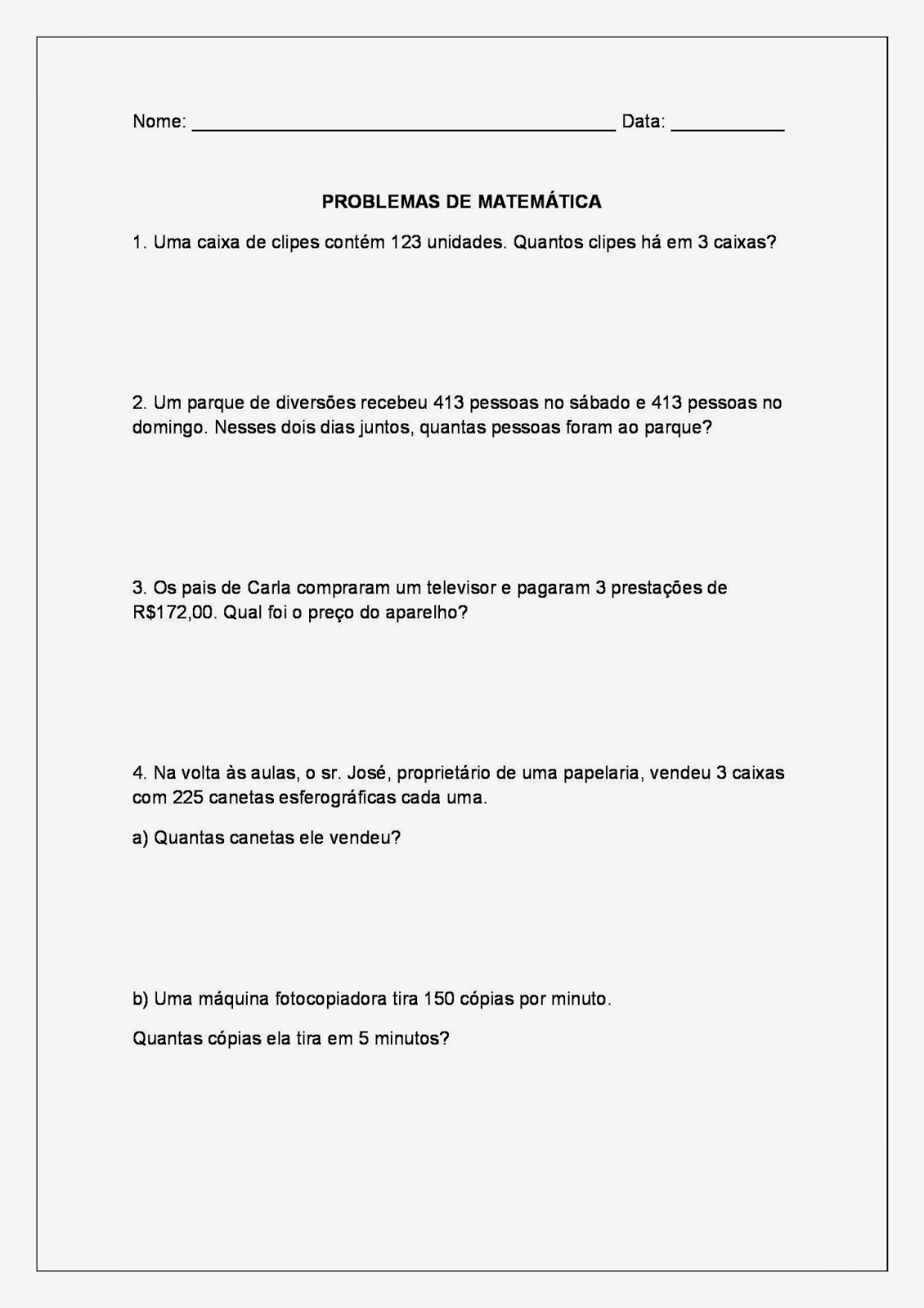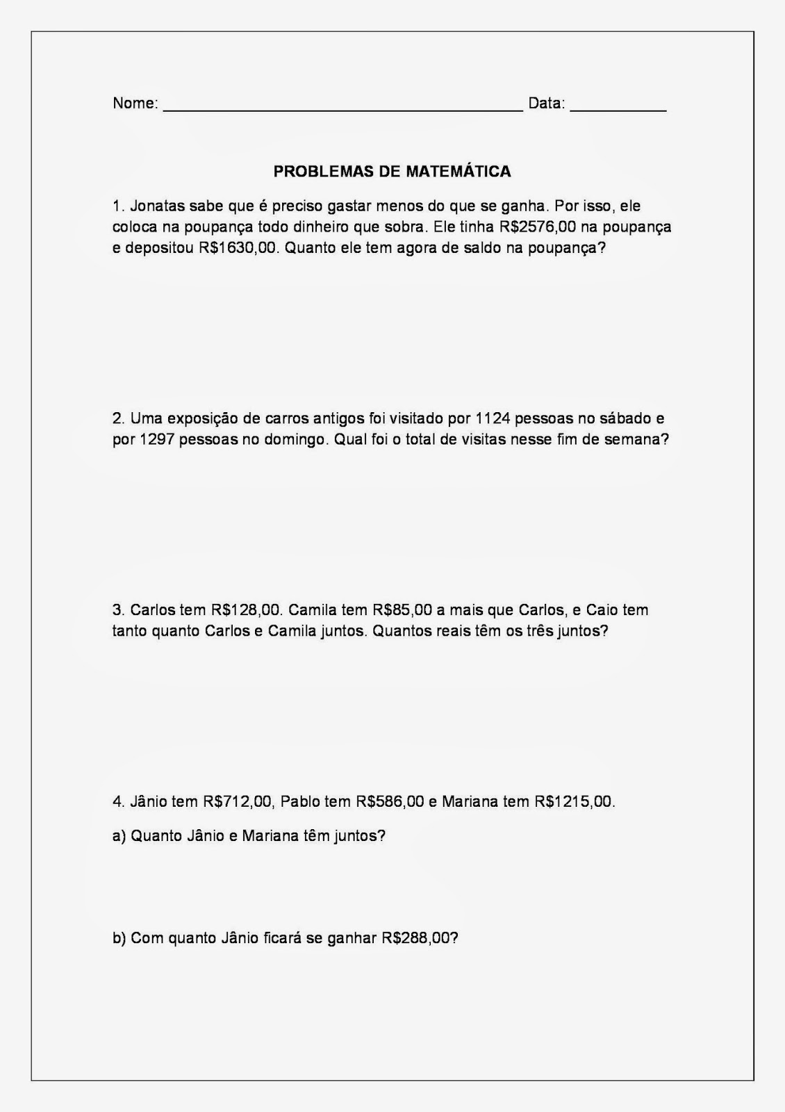 São problemas de adição, subtração, multiplicação e divisão para alunos dos primeiros anos do ensino fundamental I, problemas que serão melhor aproveitados por alunos do 2º e 3º ano do fundamental I.
