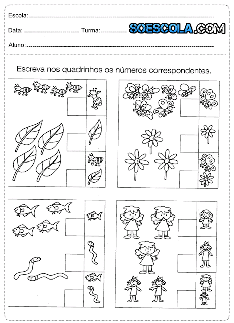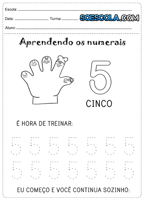 Atividades de matemática para séries iniciais que fala sobre pintar a quantidade de quadrinhos referentes à idade de cada criança, aprendendo os numerais de 1 até o 5 com atividades para cobrir e faça você mesmo, ligue o conjunto aos números correspondentes e escreva de 0 a 9 nos vagões do trenzinho.