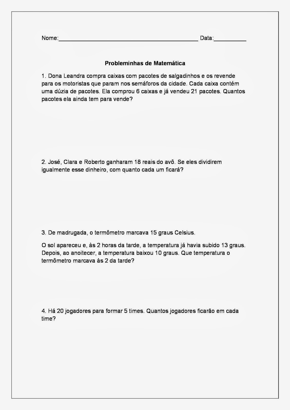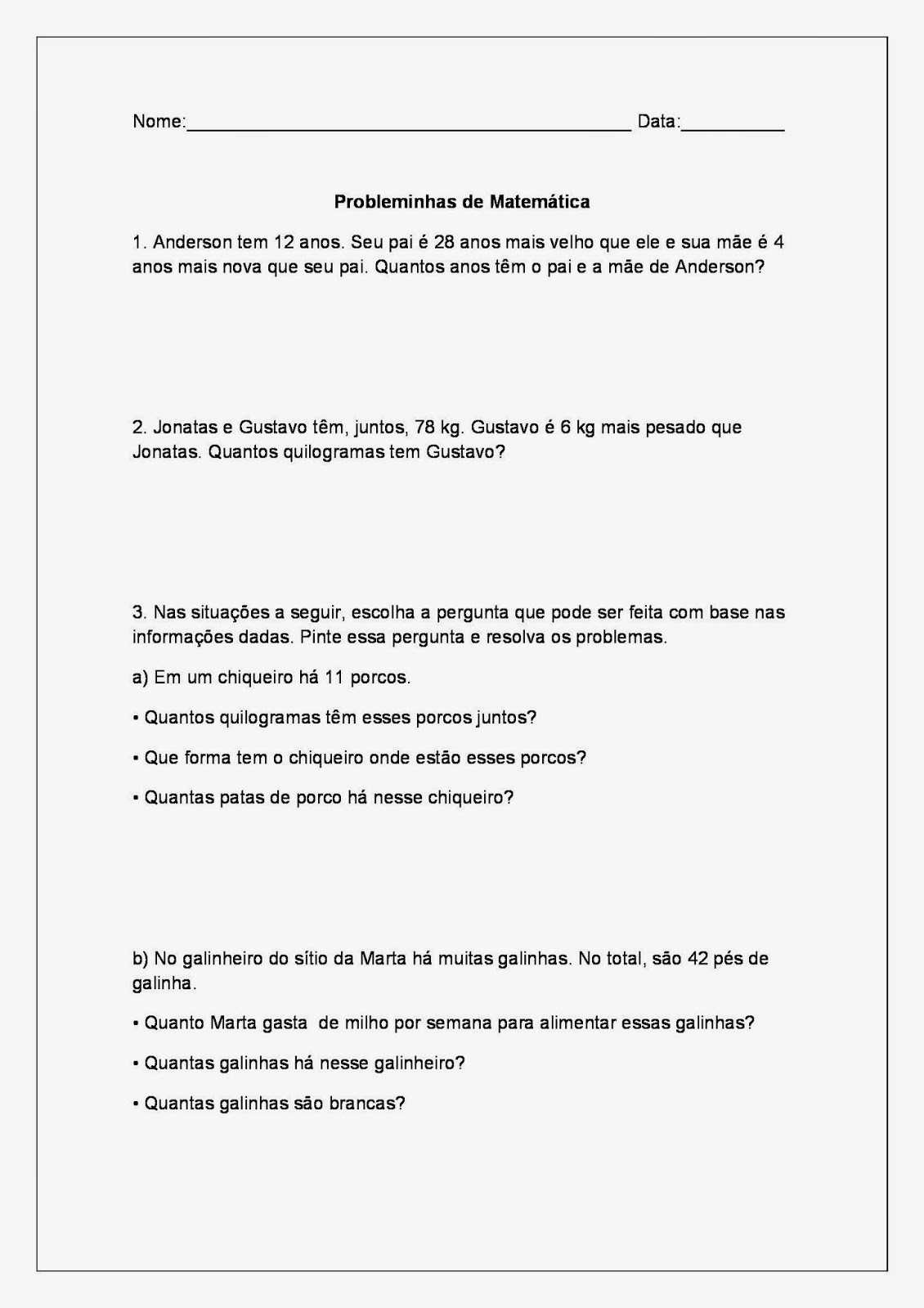 Tarefas de Matemática: O que acha de alguns probleminhas de matemática para os alunos do terceiro ano do ensino fundamental I. (3º ano do ensino fundamental).