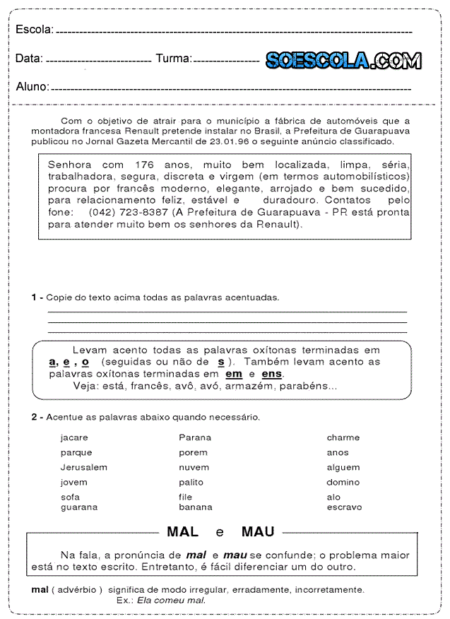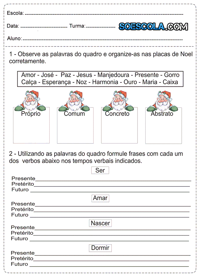 Atividades de português 5° ano para imprimir para terminar de escrever as frases, usando as palavras do quadro, passe para o plural os anúncios, encontre o sujeito para os verbos, interpretação de texto, acentuação gráfica, observe o quadro e faça a narrativa dos personagens, identifique os sujeitos próprios, comum, concreto e abstrato entre outros.