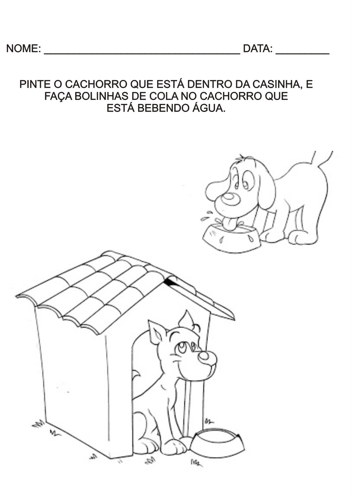 Pinte o cachorro que está dentro da casinha, e faça bolinhas de cola no cachorro que está bebendo água.