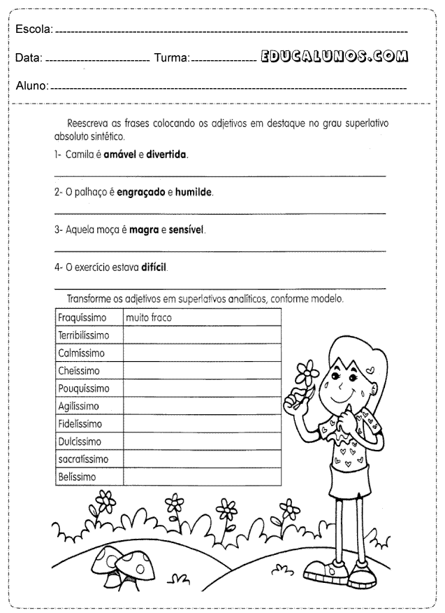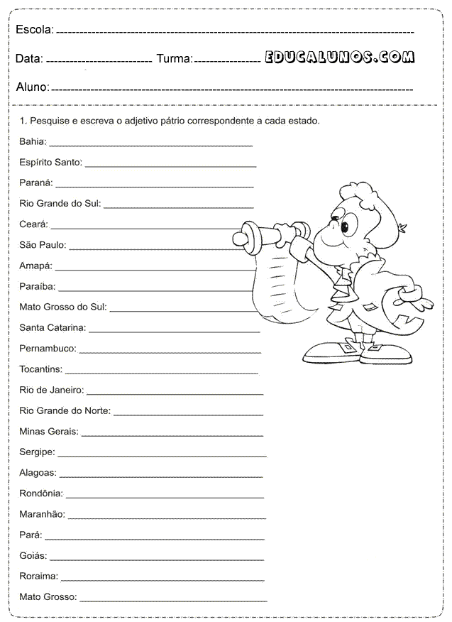 Hoje trago para vocês diversas Atividades para o 5° ano de português para pesquisar e escrever o adjetivo pátrio correspondente a cada estado, observe a cena e dê um adjetivo para cada figura numerada, descubra o segredo, interpretação de texto, adjetivo com graus superlativos e absoluto sintético.