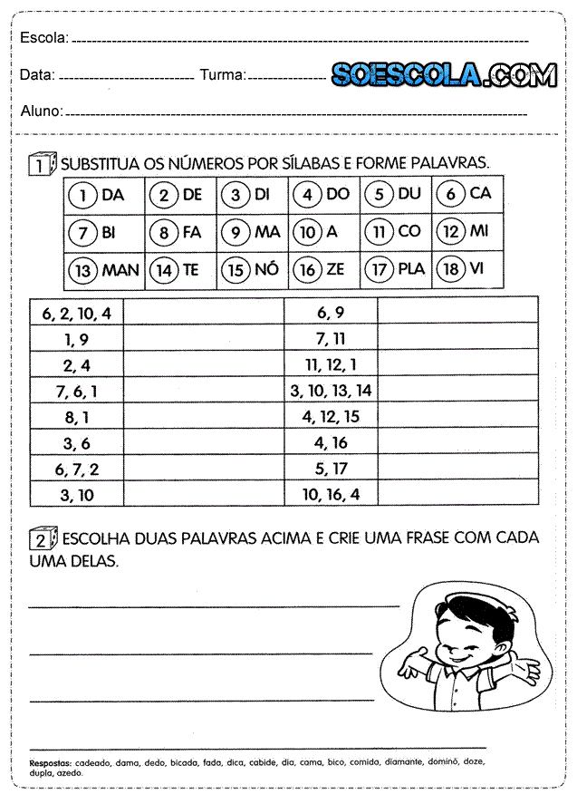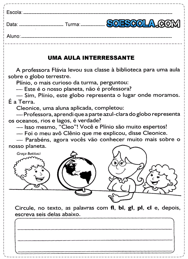 Forme substantivos comuns com 2, 3 e 4 silabas, coloque as palavras em ordem alfabética, substitua os números por silabas e forme palavras, circule no texto palavras com fl, bl, gl, pl e cl, complete com adjetivo as cruzadinhas e separe as palavras do texto em masculino e feminino.