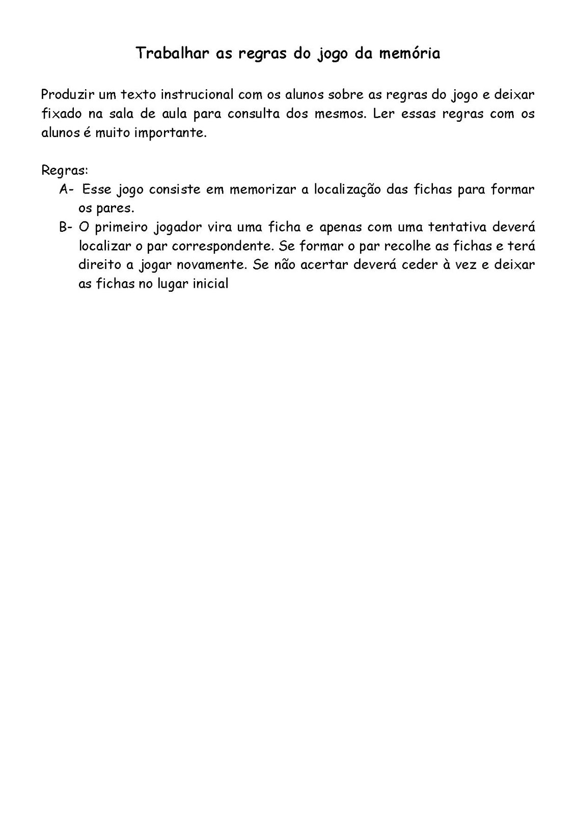 B – O primeiro jogador vira uma ficha e apenas com uma tentativa deverá localizar o par correspondente. Se formar o par, recolhe as fichas e terá direito a jogar novamente. Se não acertar, deverá ceder a vez e deixar as fichas no lugar inicial.