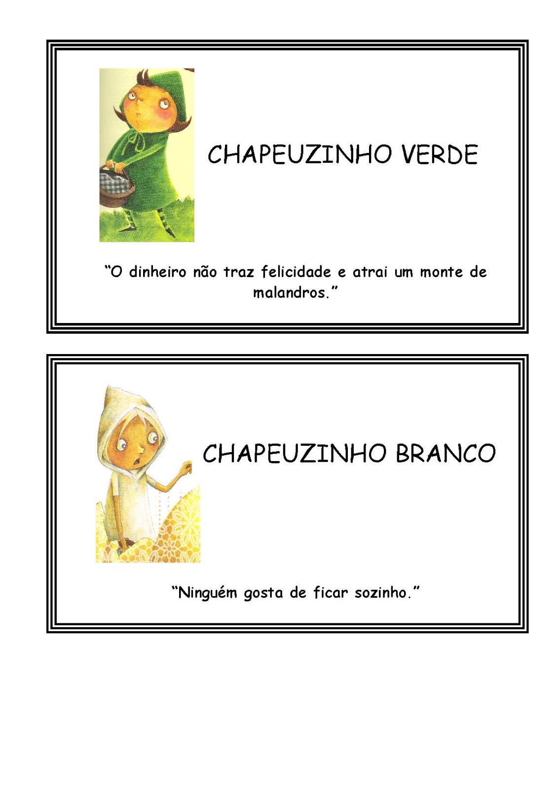 Neste livro, os alunos irão conhecer não a habitual Chapeuzinho vermelho, mas as Chapeuzinhos azul, verde, branco, lilás, preto e cor de abóbora. Cada uma com uma personalidade diferente, dependendo da cor de suas vestimentas. Uma é gulosa, a outra é vaidosa, e ainda outra é interessada em dinheiro… Mas todas as histórias não perdem sua essência. Com músicas melodiosas, e letras totalmente diferentes de “Pela estrada afora eu vou tão sozinha, levar esses doces para a vovozinha”, as personagens são trocadas por lobos bons, vovozinhas espertas e caçadores não tão corajosos. Também são abordados temas muito interessantes, como a morte, o tempo e os sonhos.