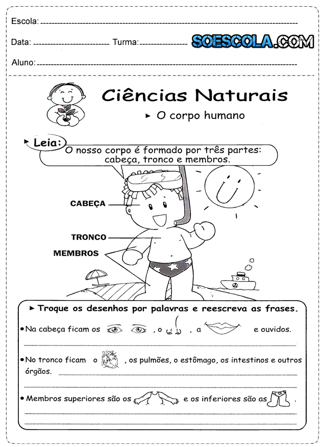 Confira algumas Atividades de ciências para o 1° ano do ensino fundamental, com exercícios que falam sobre higiene bucal, identifique os órgãos dos sentidos, paladar, tato, olfato e audição, identifique os animais pelas pistas propostas no exercício, descreva o corpo humano e escreva o que acontece com a plantinha.