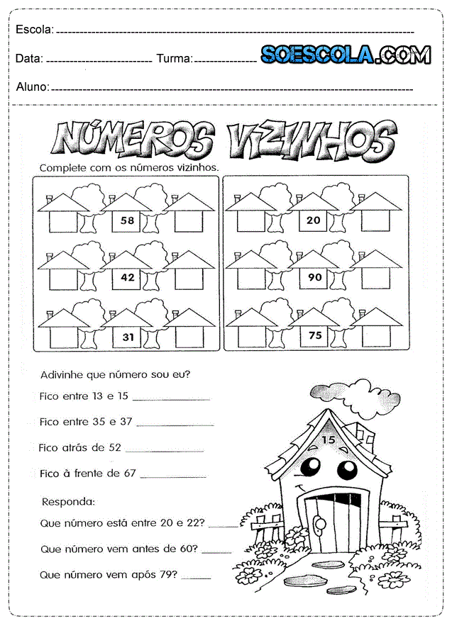 São Exercícios como frações para 1° série, cálculos de somar, números vizinhos, quebra cuca com o menor número e o maior número para adivinhar.