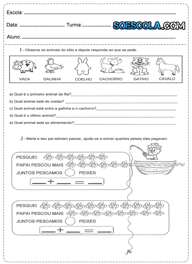 Atividades de matemática 1° série com perguntas do tipo: Qual é o primeiro animal da fila, Maria e seu pai adoram pescar, ajude-os a somar quais peixes ele pegaram, veja a sequencia numérica que aparece na bandeira entre 7 e 9 esta o número?