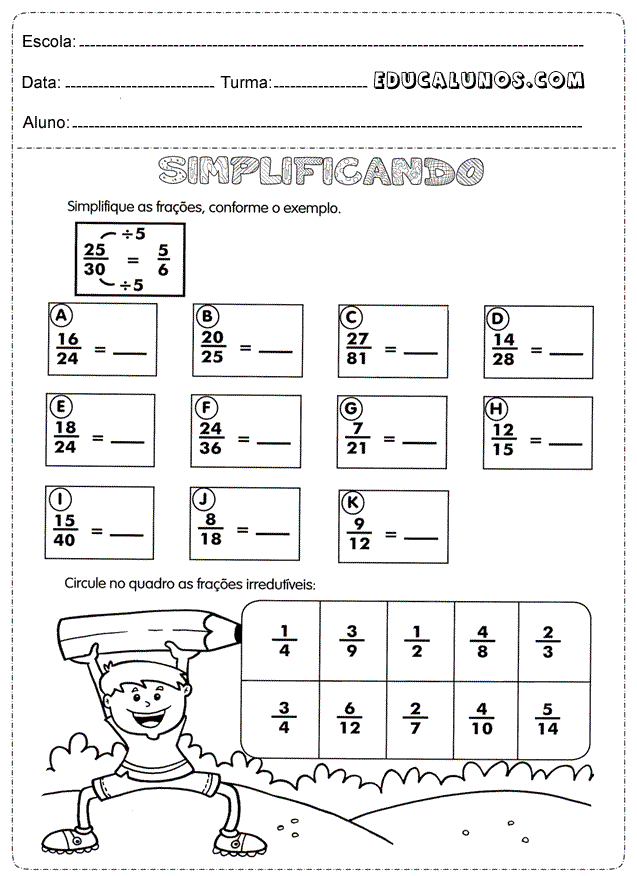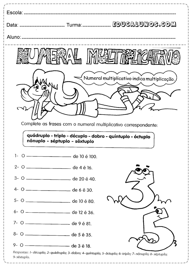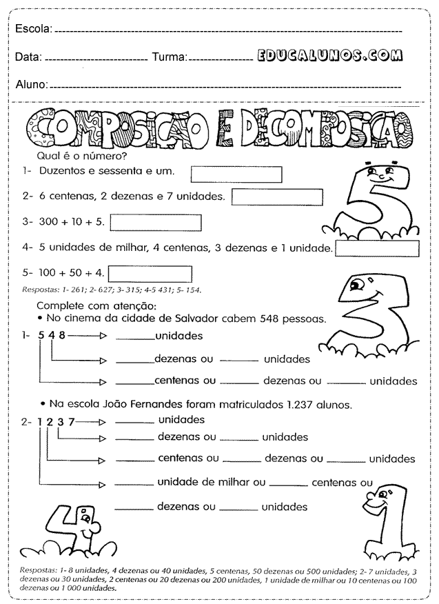 Atividades de matemática 4° ano para imprimir e baixar com os seguintes exercícios: Numeral multiplicativo, composição e decomposição, operações de soma, subtração e divisão além de atividades sobre frações e aprenda a usar o sinais de igual a, diferente de, menor que e maior que.