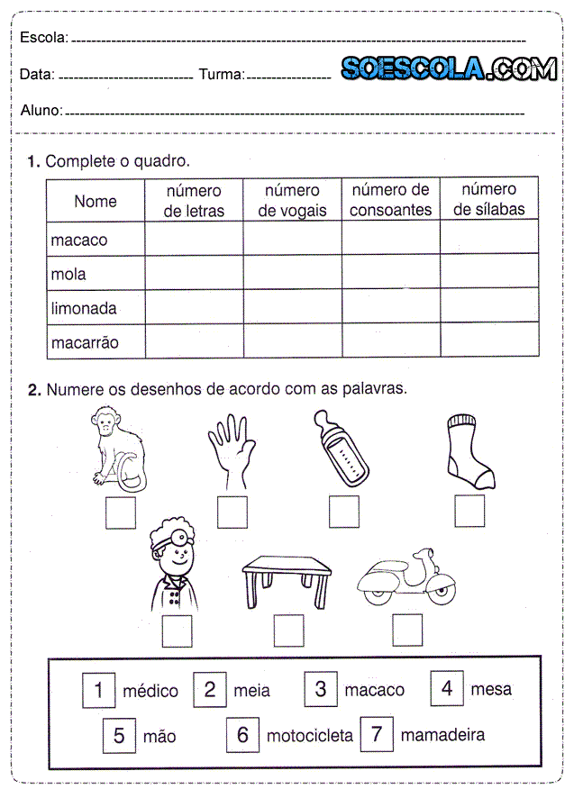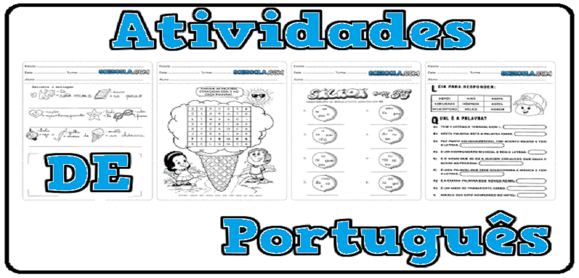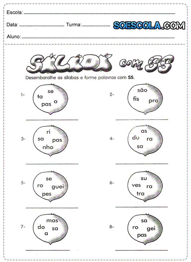 Atividades de português 2° ano para imprimir, com os seguintes exercícios: Complete o quadro e numere os desenhos de acordo com as palavras, leia e responda, marque as palavras começando com S no caça palavras, complete a oração de acordo com o desenho e desembaralhe as silabas e forme palavras com SS.