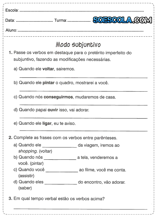 Atividades de português para o 5° ano do ensino fundamental sobre: Modo subjuntivo, conjunção do verbo, interpretação de texto, atividades de sinônimo e antônimo, complete as palavras com G ou J, complete usando Traz ou Atrás e destaque os dígrafos.