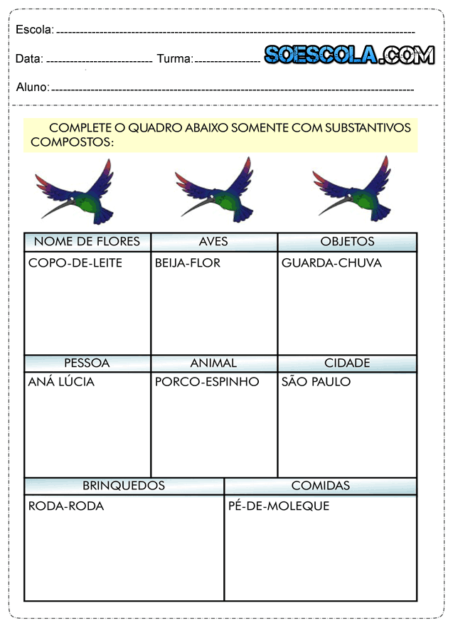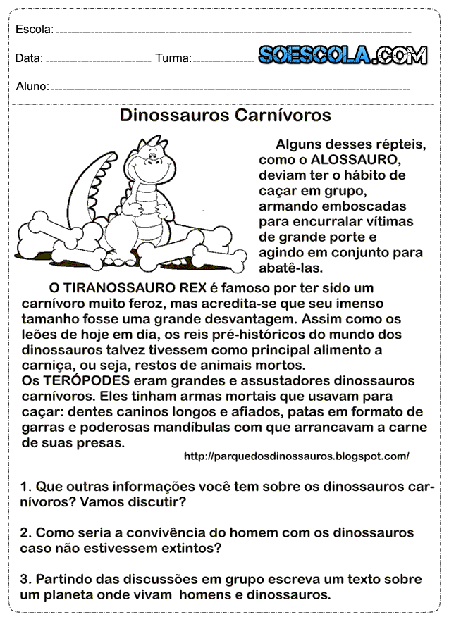 Atividades de português para o 4° ano do ensino fundamental, com questões que falam sobre, interpretar o texto dos dinossauros carnívoros, termine de escrever frases usando palavras no quadro, complete a palavra da frase utilizando informações do texto e sublinhe os substantivos.