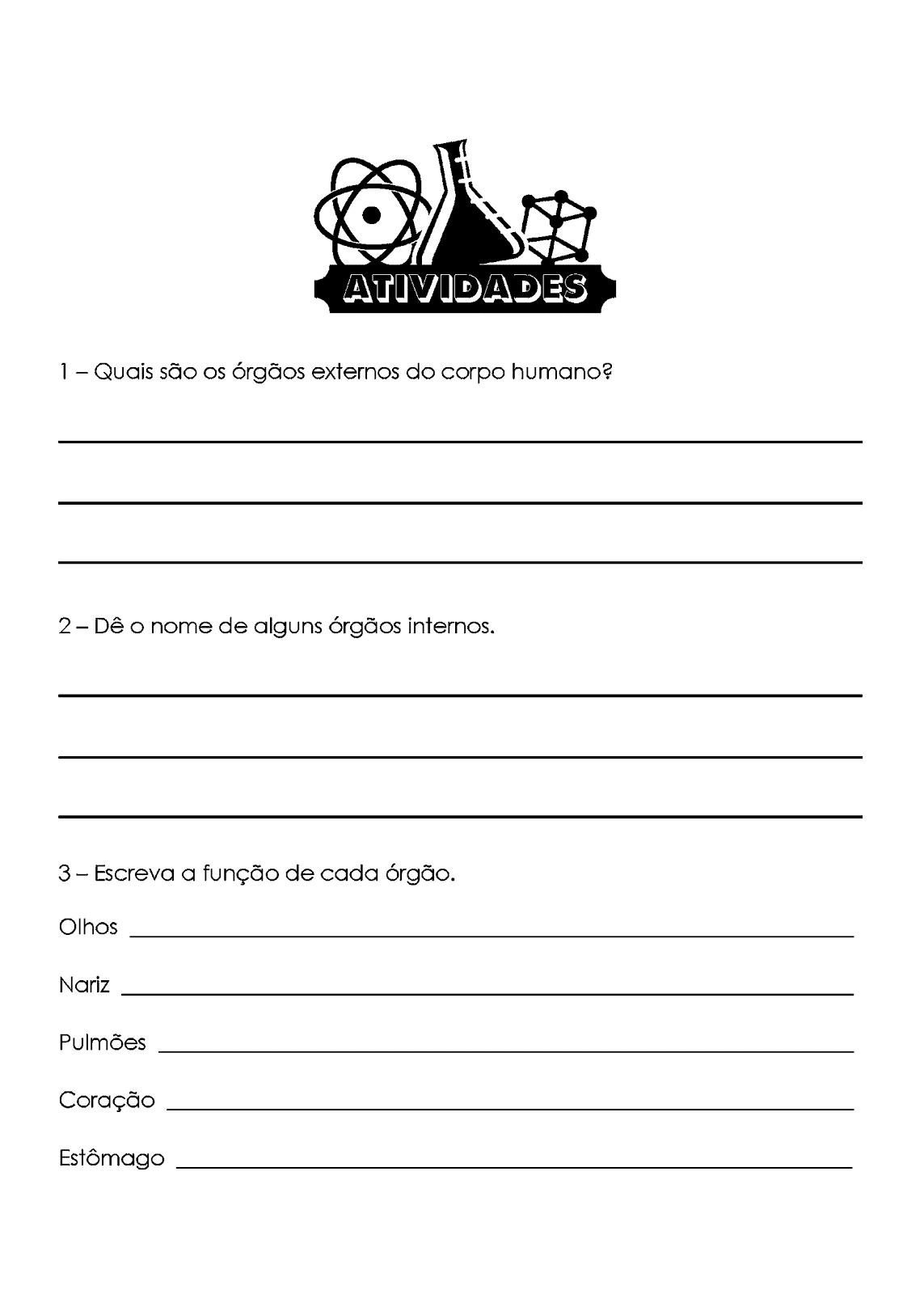 Textos e atividades das partes do corpo humano: regiões do corpo, células, tecidos, órgãos, ossos e articulações.