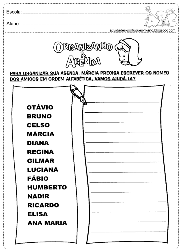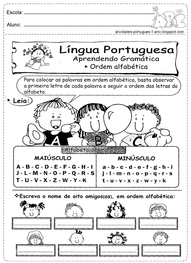 Atividades de gramática para o 1°, 2° e 3° ano do fundamental, com exercícios do tipo: Leia as dicas e ligue cada nome ao seu respectivo dono, escreva o nome dos colegas que começam com a letra A, escreva em ordem alfabética e escreva as letras minúsculas o alfabeto.