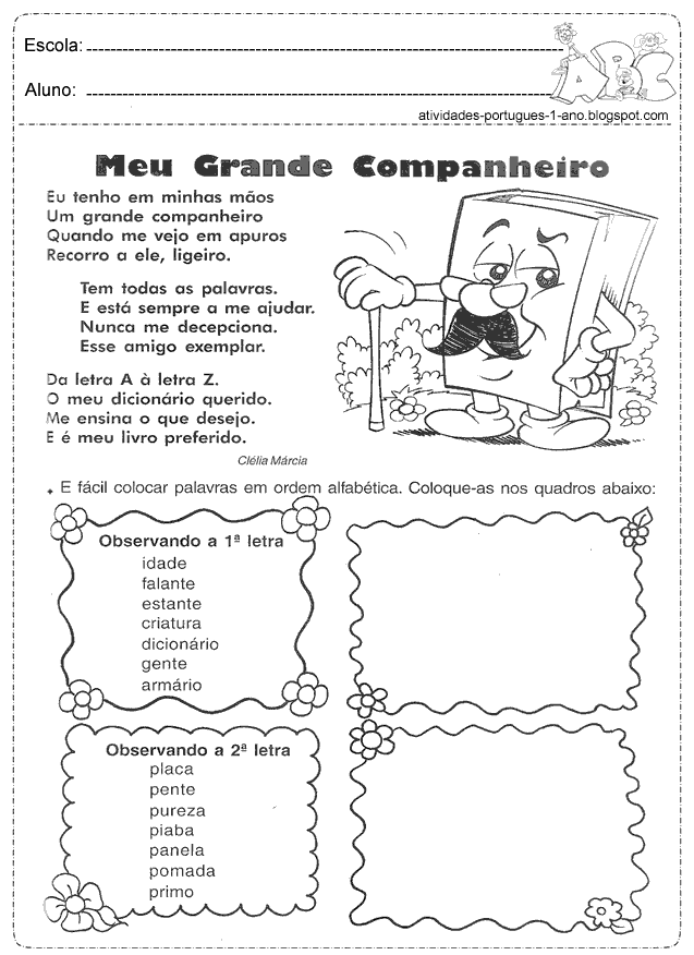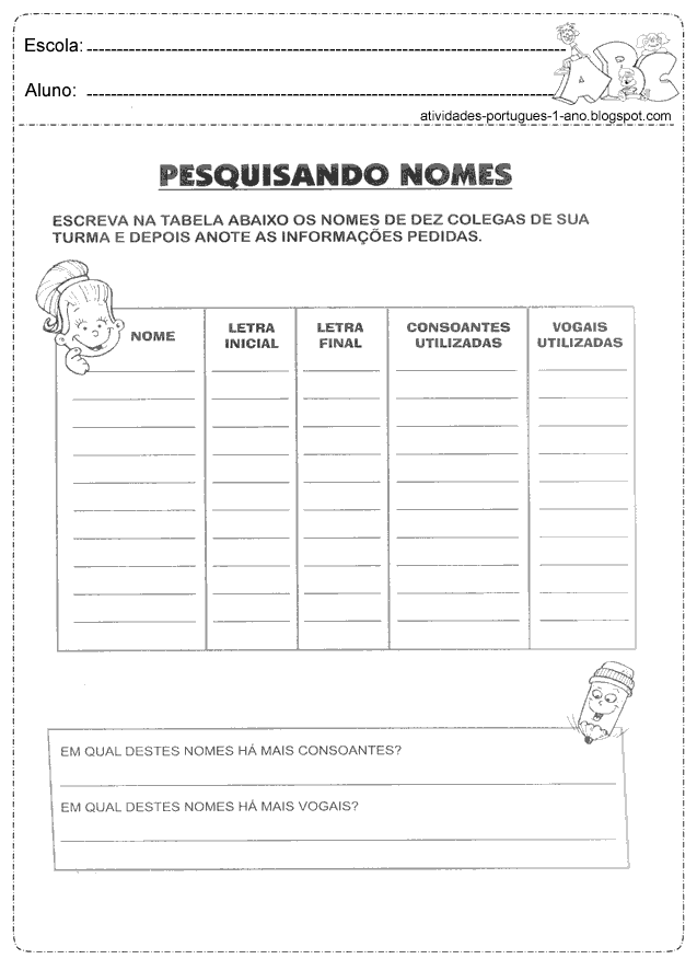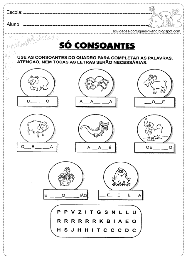 Atividades de gramática para o 1°, 2° e 3° ano do ensino fundamental com exercícios do tipo: Escreva os nomes das doze figuras iniciadas com consoante, separe a silaba das figuras, separe as silabas e descubra a palavra, coloque as letras de cada grupo em ordem alfabética e escreva o nome dos colegas na tabela.
