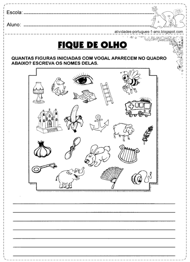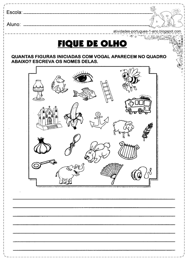 | Quantas figuras iniciadas com vogal, aparecem no quadro e escreva os nomes delas |