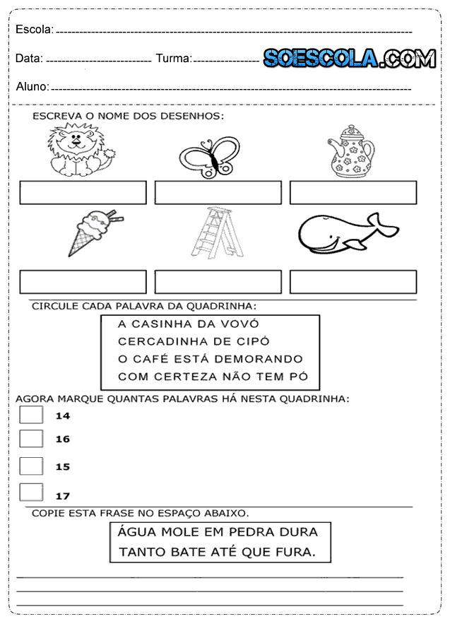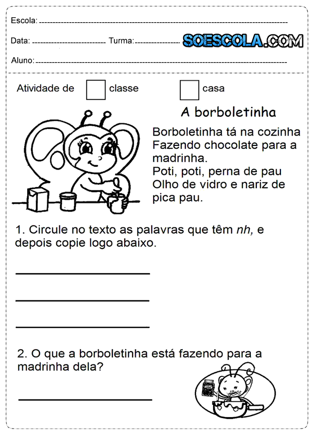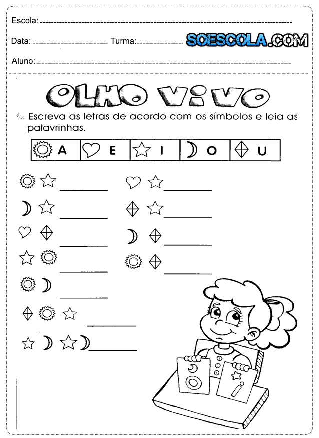 Atividades de Português 1° ano para imprimir, com os seguintes exercícios, escreva as letras de acordo com os símbolos e leia as palavrinhas, circule no texto as palavras que tem nh, junte as letras e forme interjeição, complete as palavras e ligue as vogais maiúsculas as minusculas.
