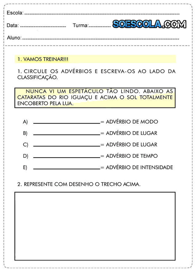 Sumario das atividades: Atividade produtiva de texto, organize as sílabas para escrever o nome das figuras, interpretação de texto, circule os advérbios e escreva ao lado da classificação, complete as frases com verbos, reescreva o nome das figuras utilizando somente as sílabas necessárias e atividades sobre artigos definidos e indefinidos