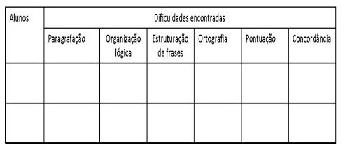 Esse é mais um recurso que o professor deverá utilizar para tabular e detectaras dificuldades encontradas na produção de textos dos alunos. Detectados os problemas, o professor buscará estratégias, como a revisão coletiva ou individual dos textos, para aprimorar a escrita.