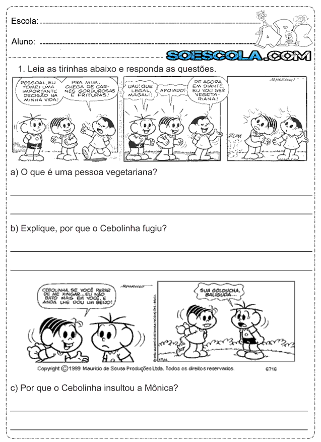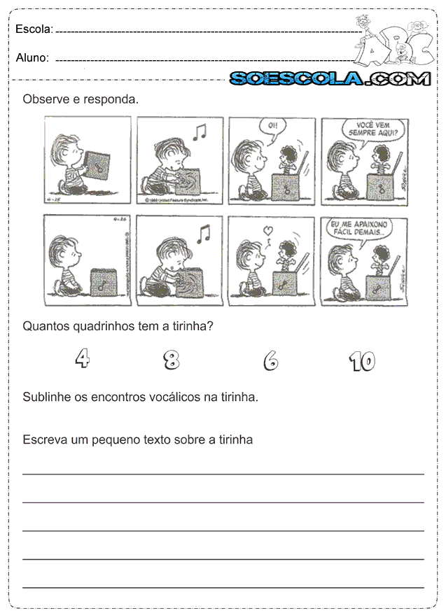 Atividades para interpretação de texto com tirinhas, são exercícios para o primeiro ano do ensino fundamental com tirinhas do tipo: para quem Snoopy está escrevendo, observe a tirinha e responda, o que é uma pessoa vegetariana, quais são os personagens que aparecem na tirinha e atividades de encontros vocálico.