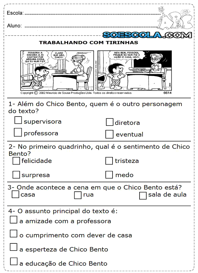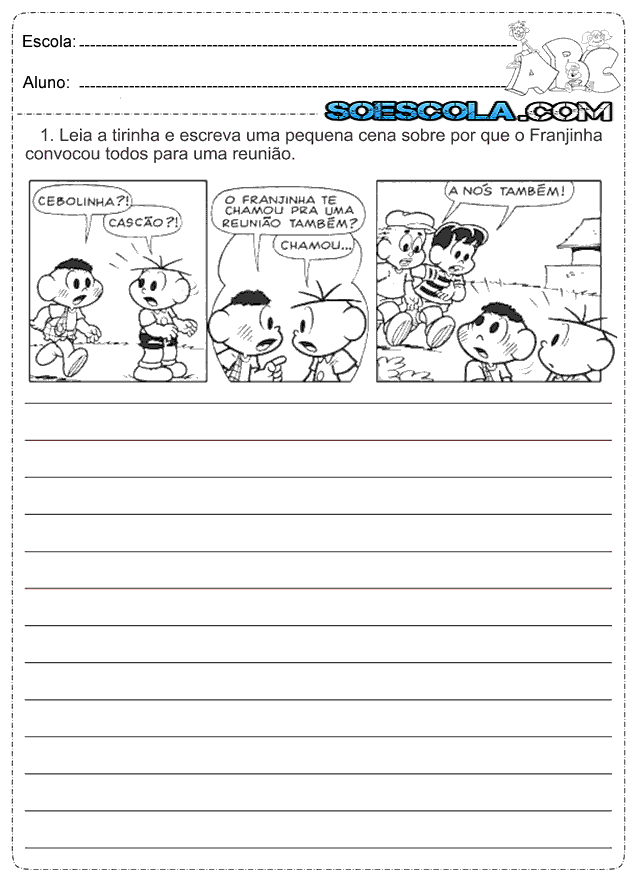 - Leia a tirinha e escreva uma pequena cena sobre por que o Franjinha convocou todos