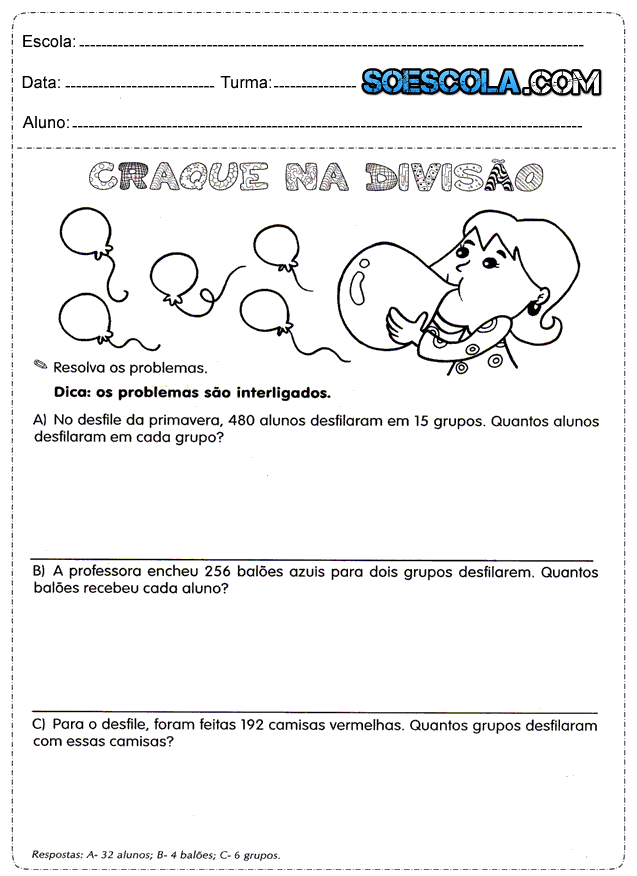 Problemas de matemática para o 3° ano do ensino fundamental que te ajuda a compreender melhor as perguntas, vamos a um exemplo: No desfile da primavera, 480 alunos desfilaram em 15 grupos. Quantos alunos desfilaram em cada grupo? Responda essa e outras questões gratuitamente e prontas para imprimir.