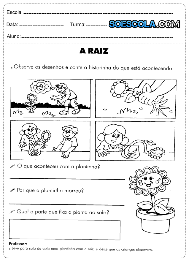 responder perguntas do tipo: O que esta acontecendo com a plantinha? Por que a Plantinha morreu? Qual a parte que fixa a planta ao sono? Entre outras