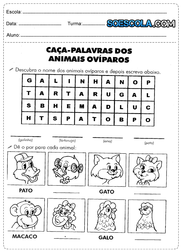 Atividades de ciências 2° ano animais mamíferos, vivíparos e ovíparos, descubra o nome dos animais no caça palavras e depois escreva-os, ligue o animal ao que ele gosta de comer, Descubra se os animais no sítio do vovô que são domésticos, aquáticos, terrestres e selvagens.