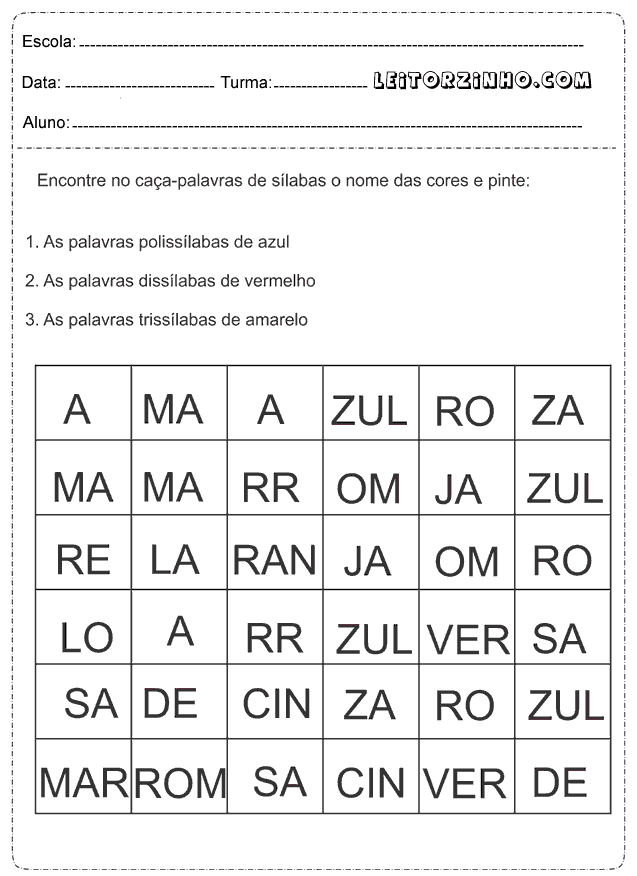 | Encontre no caça-palavras de sílabas o nome das cores e pinte |