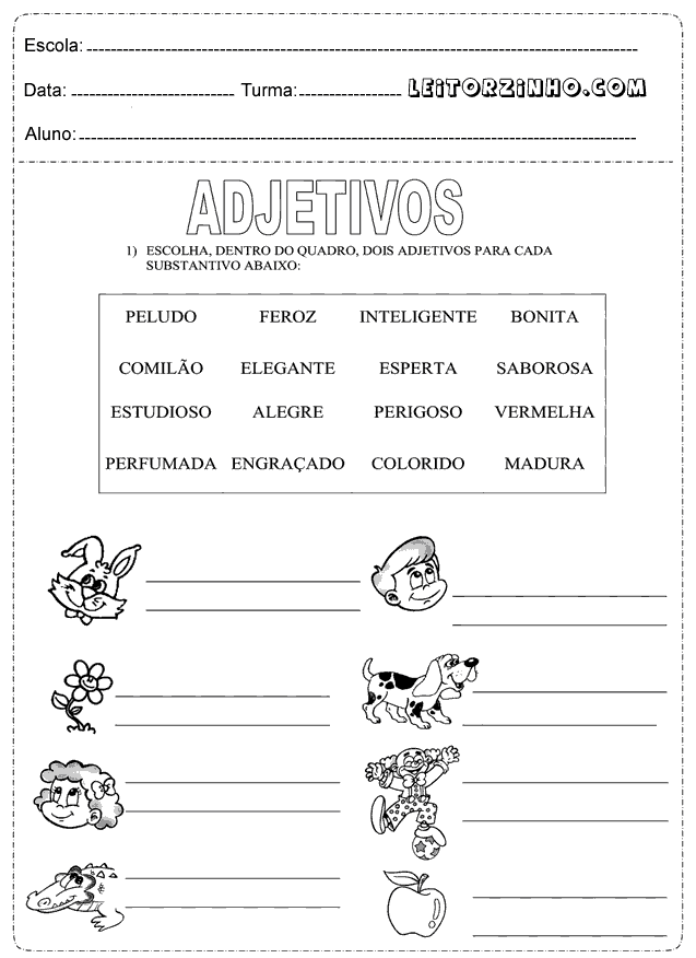 | Escolha, dentro do quadro, dois adjetivos para cada substantivo |