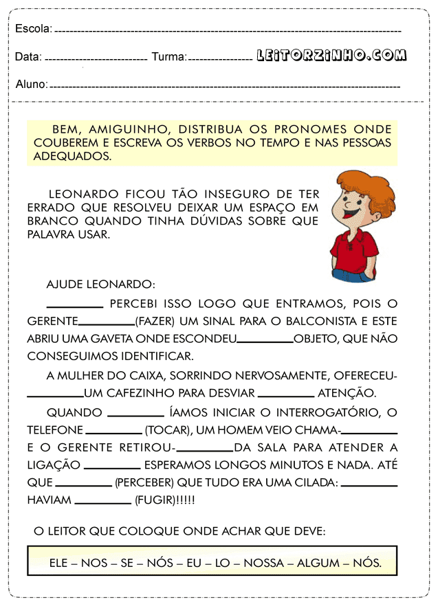| Bem, amiguinho, distribua os pronomes onde couberem e escreva os verbos |