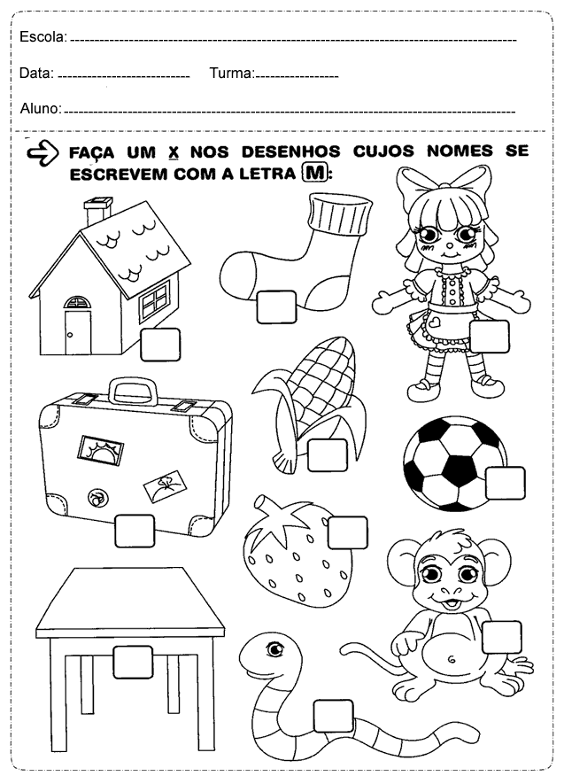 As atividades falam sobre: Faça um X nos desenhos cujos nomes se escrevem com a letra M, complete as palavras do alfabeto ilustrado com as vogais, encontre as palavras e reescreva-as, Ligue as letras do alfabeto correspondente, numere as palavras de acordo com seu nome e reescreva as frases de acordo com o desenho.
