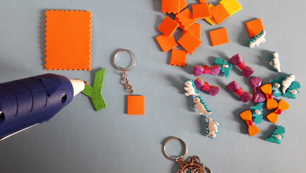 4- Recorte um quadradinho de EVA que seja suficiente para cobrir a corrente da argola de chaveiro e fixe com cola quente.