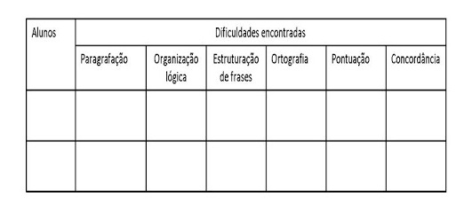 Esse é mais um recurso que o professor deverá utilizar para tabular e detectaras dificuldades encontradas na produção de textos dos alunos. Detectados os problemas, o professor buscará estratégias, como a revisão coletiva ou individual dos textos, para aprimorar a escrita.