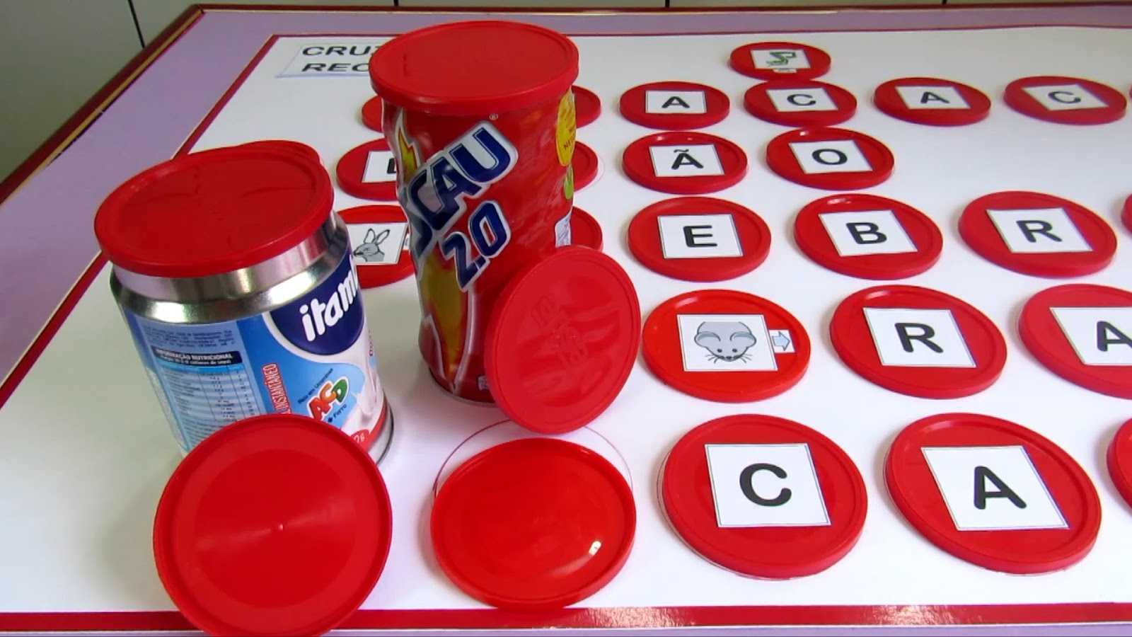 Aqui está mais uma interessante ferramenta lúdica reciclada, de baixíssimo custo e muito fácil de ser construída. Dessa vez usaremos tampinhas de Nescau ou de leite em pó, que serão as peças principais dessa divertida brincadeira e que já é bastante conhecida das crianças.
