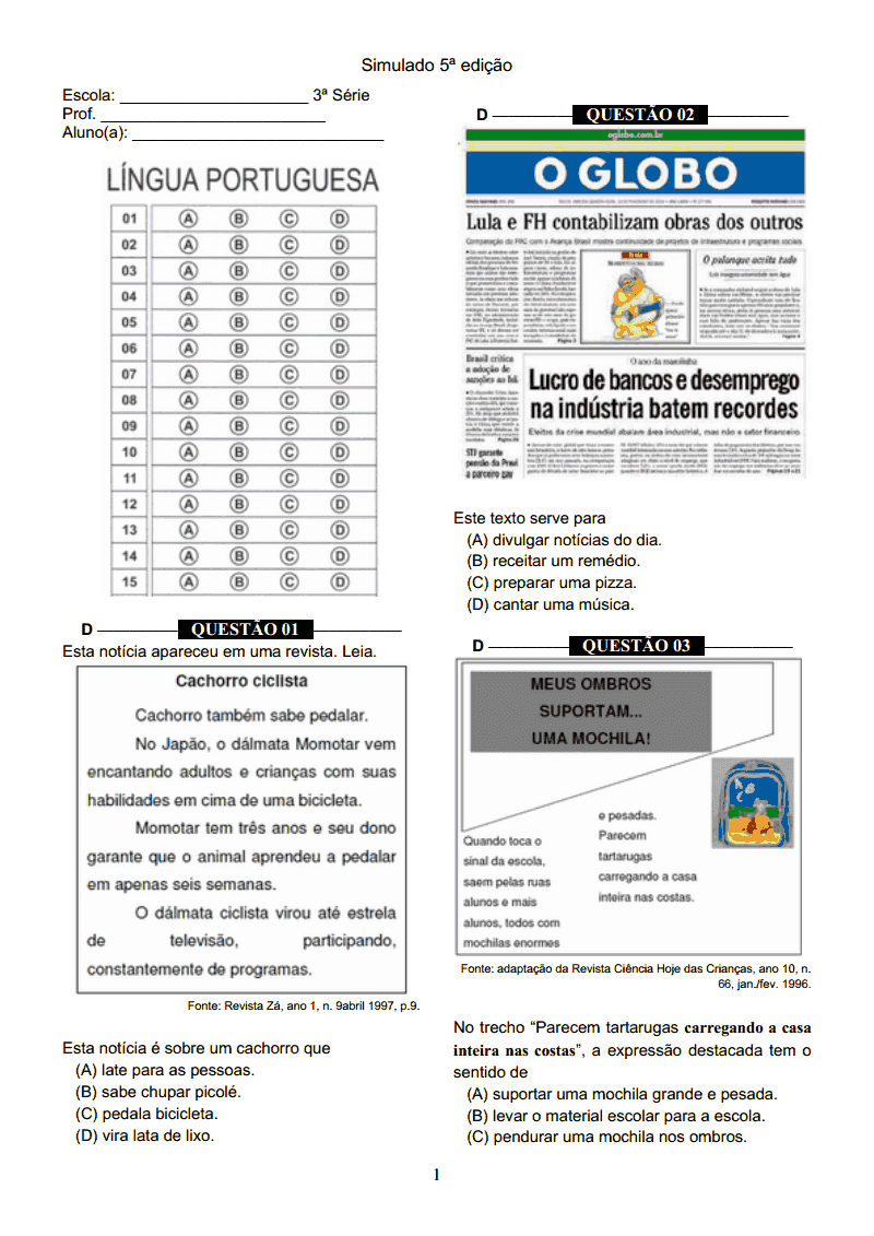 SIMULADO LÍNGUA PORTUGUESA 3º ANO