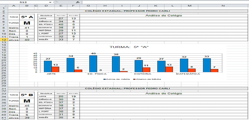 Nas primeiras planilhas estão os gráficos por série, quando devem ser inseridos os dados. As outras já ficam prontas automaticamente, por disciplinas, e a última é uma planilha de movimentação. Obs.: inserir os dados somente nas células em branco, as outras têm fórmulas. Apresenta, também, gráfico de movimentação dos alunos, pois quando um aluno desiste ou é transferido aparece o índice em todas as disciplinas.
