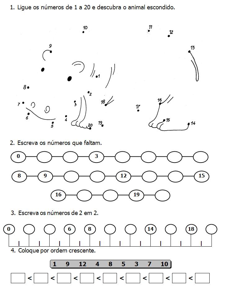 - Na 1ª atividade tem uma exercício para ligar os números de 1 a 20, completar os números que faltam de 0 a 20, escrever os números de 2 em 2 e colocar os números em ordem crescente.