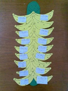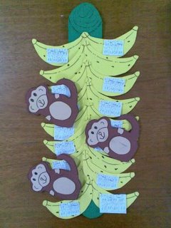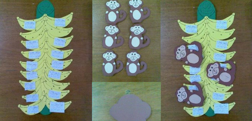 Distribuir um macaquinho para cada dupla onde eles terão que pegar um papel que estará atrás dele. Os alunos terão que copiar as contas no caderno e resolve-las, logo terão que ir até o cacho de banana e por o macaquinho na banana que estiver com os resultados.