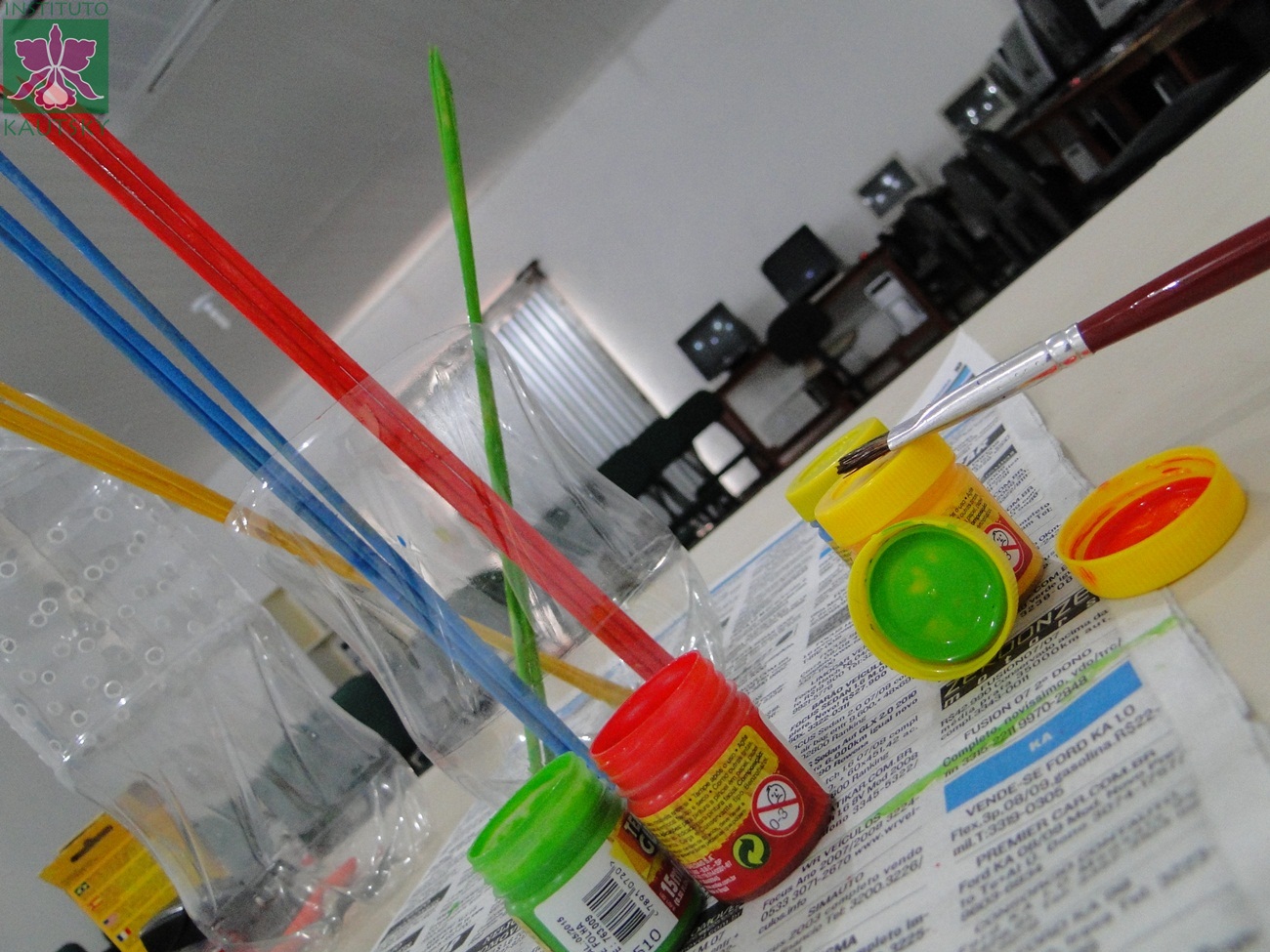 Agora é hora de montar o jogo: os palitos devem ser dispostos nos furinhos da garrafa, e cada jogador tem que tirar um palito por rodada, sem deixar cair as tampinhas. Divirtam-se neste Dia das Crianças, não só as crianças, mas adultos, adolescentes, idosos… a reciclagem é para TODOS!